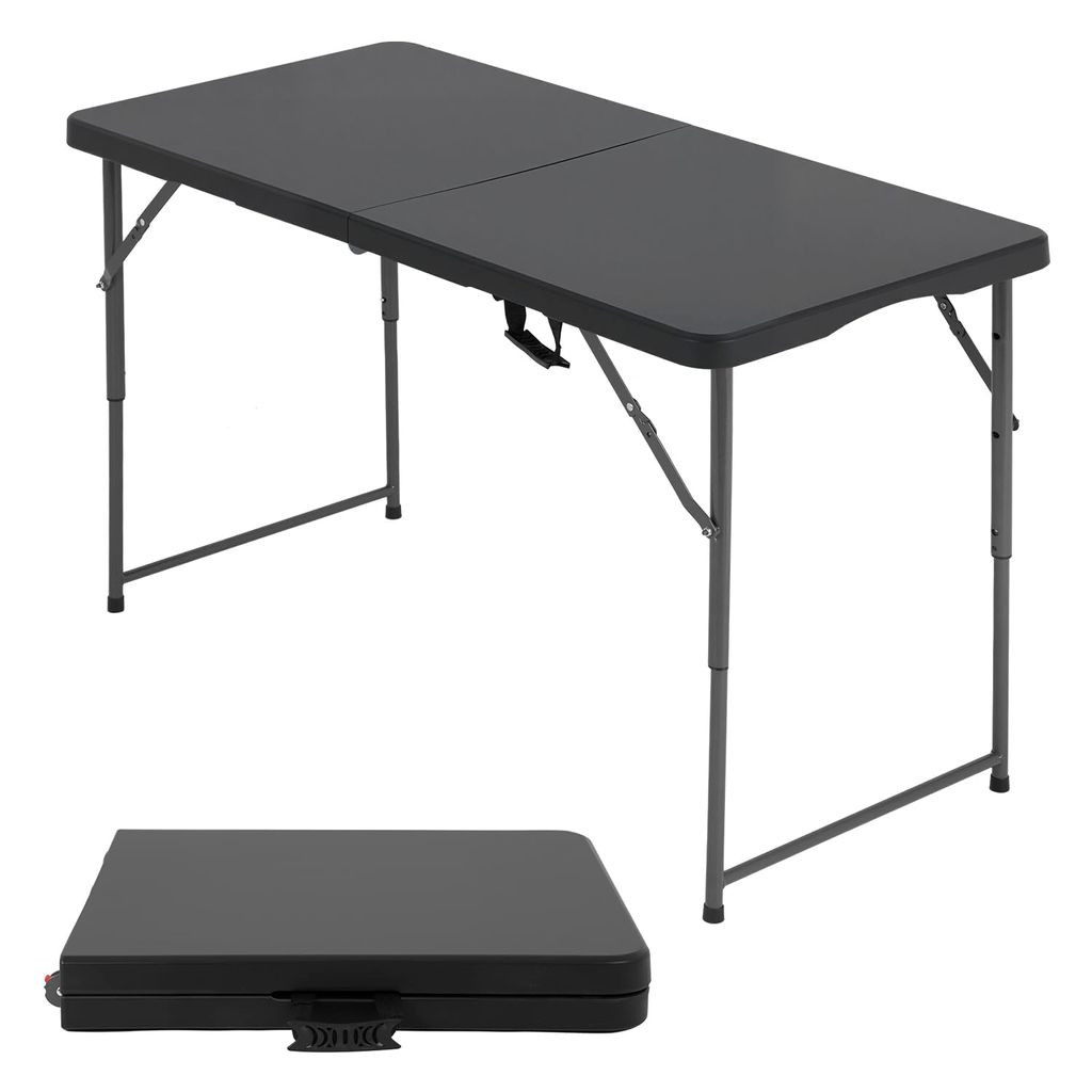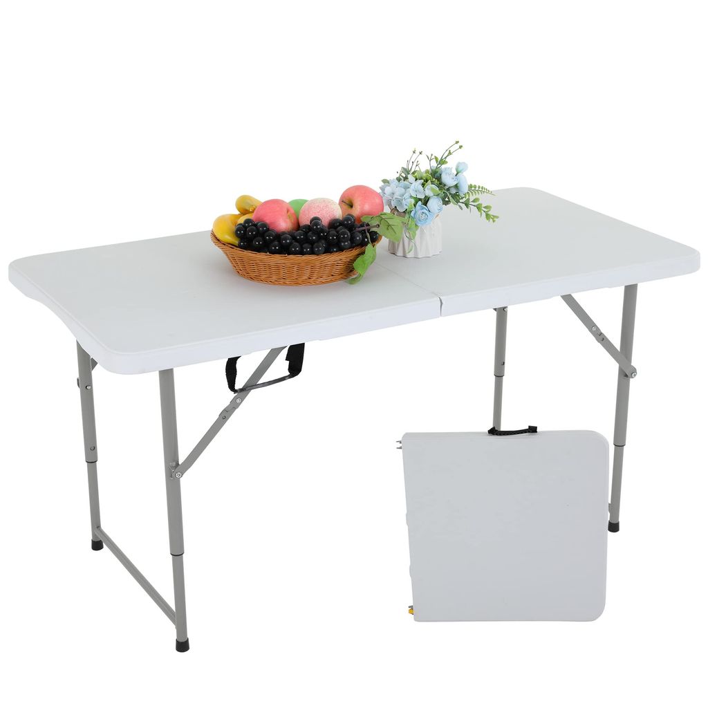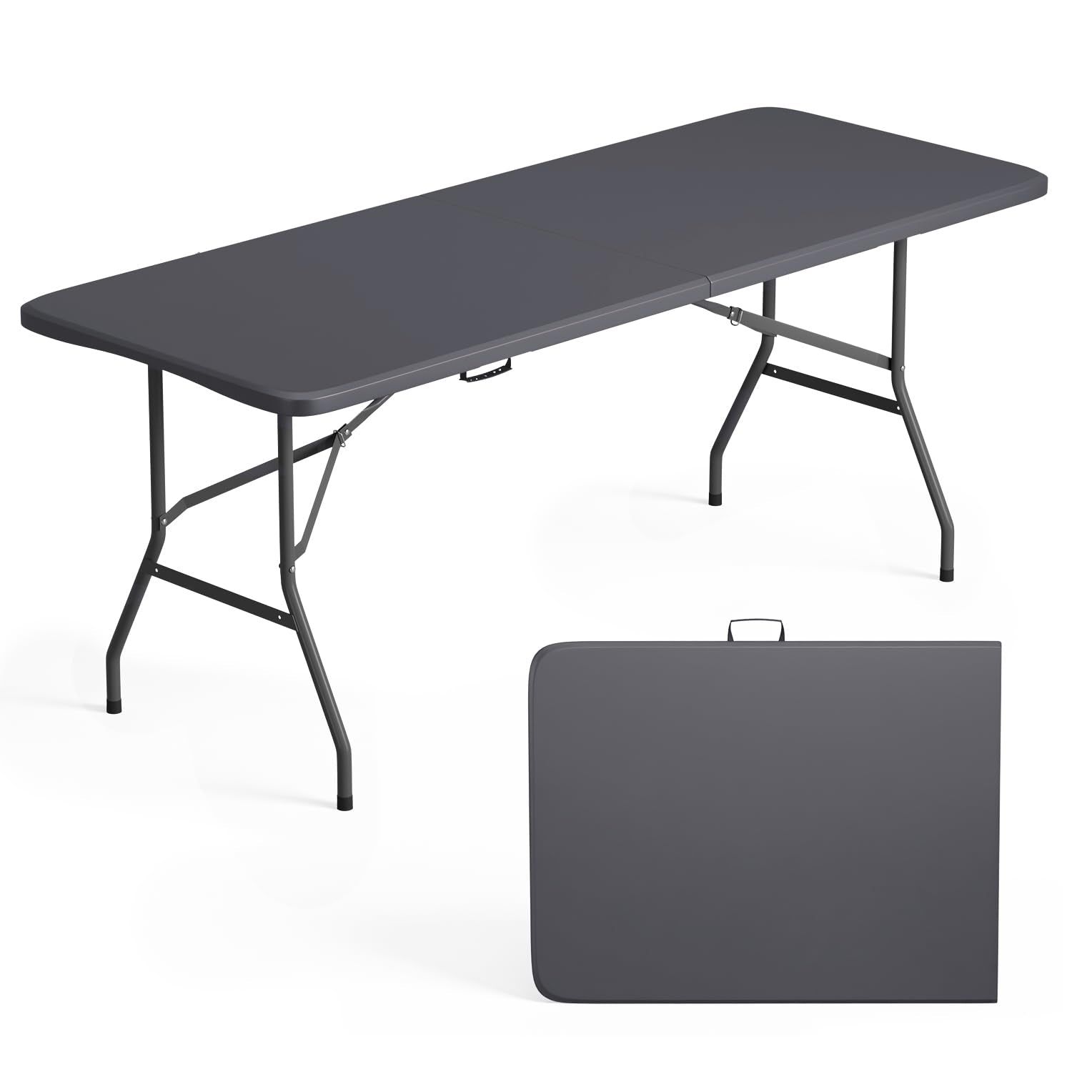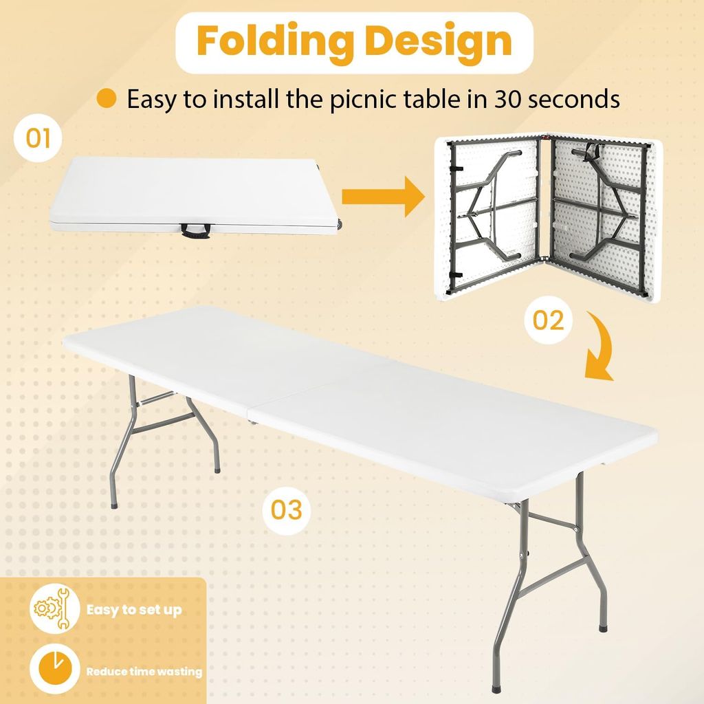 The folding table with Powder-coated steel legs,it can be open and folded in a few seconds.The 6 foot folding table features a waterproof top that resists spills and weather.It is designed with enough room to seat 4-6 people.Ideal for parties, backyard events, traveling, family exercises, etc. You can take the plastic table to everywhere you want.