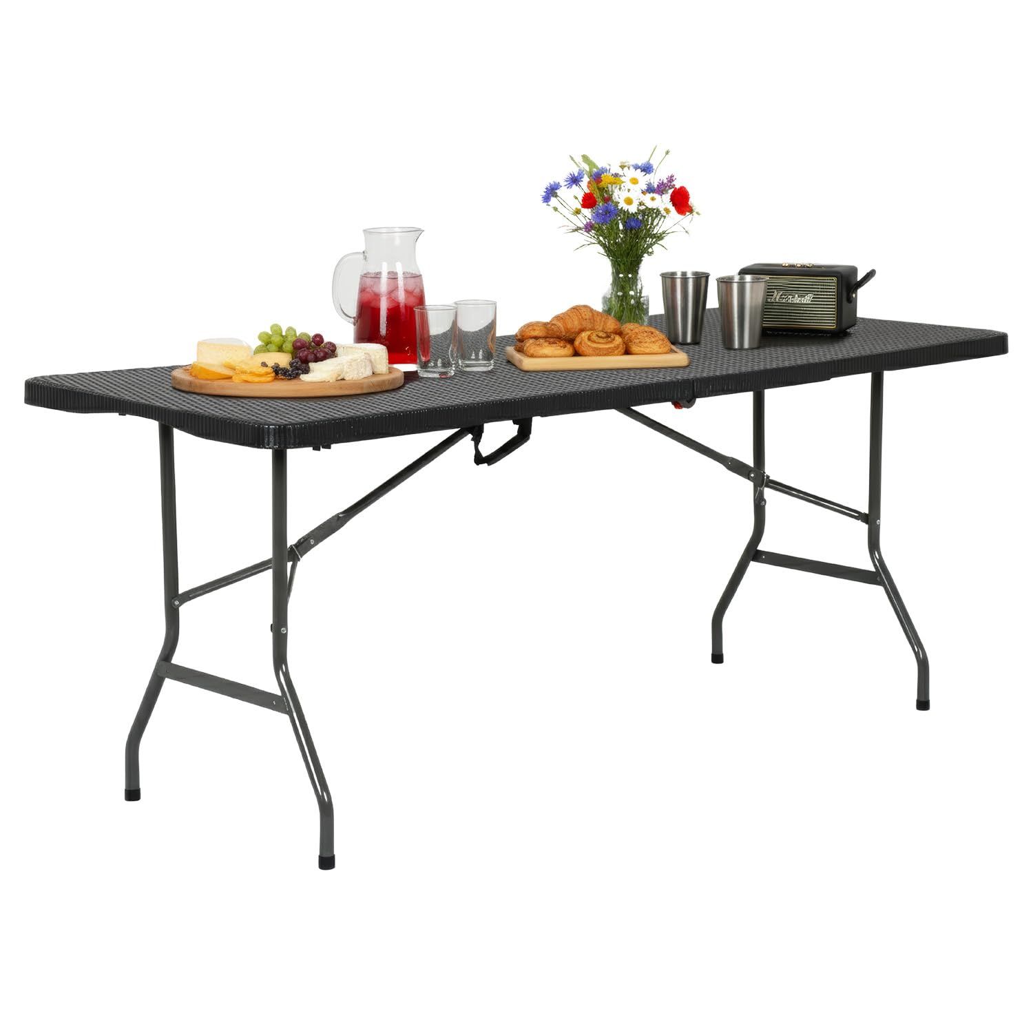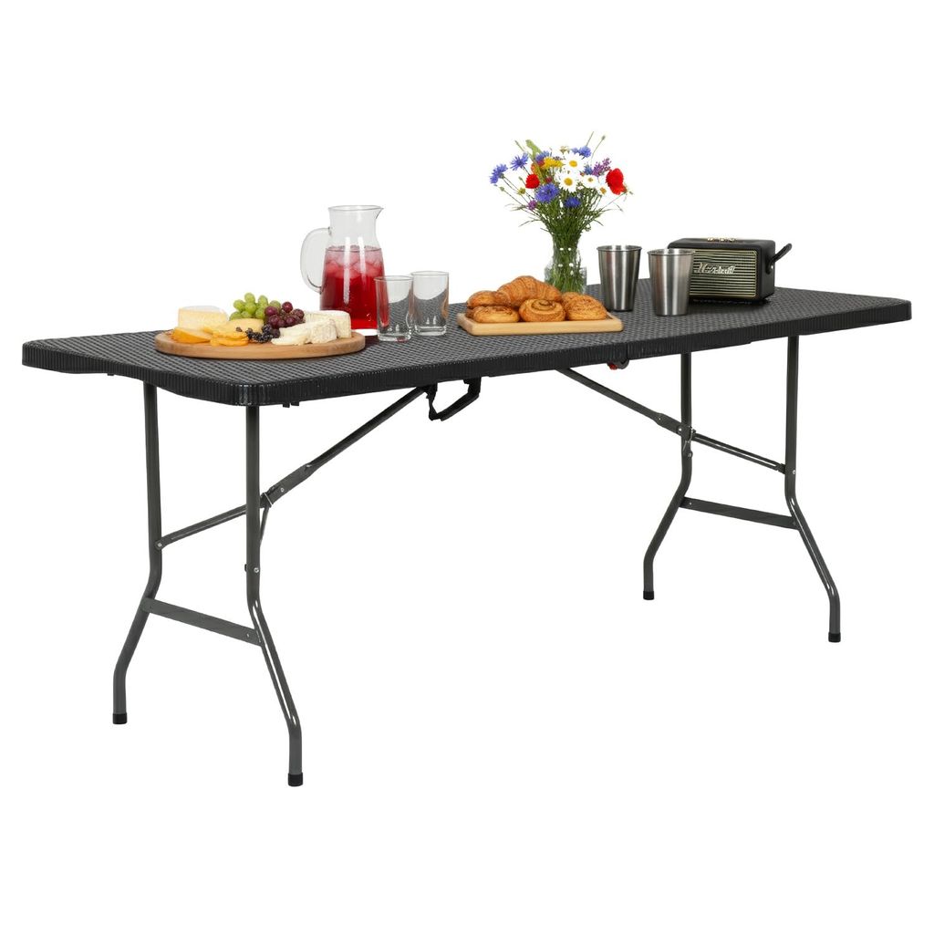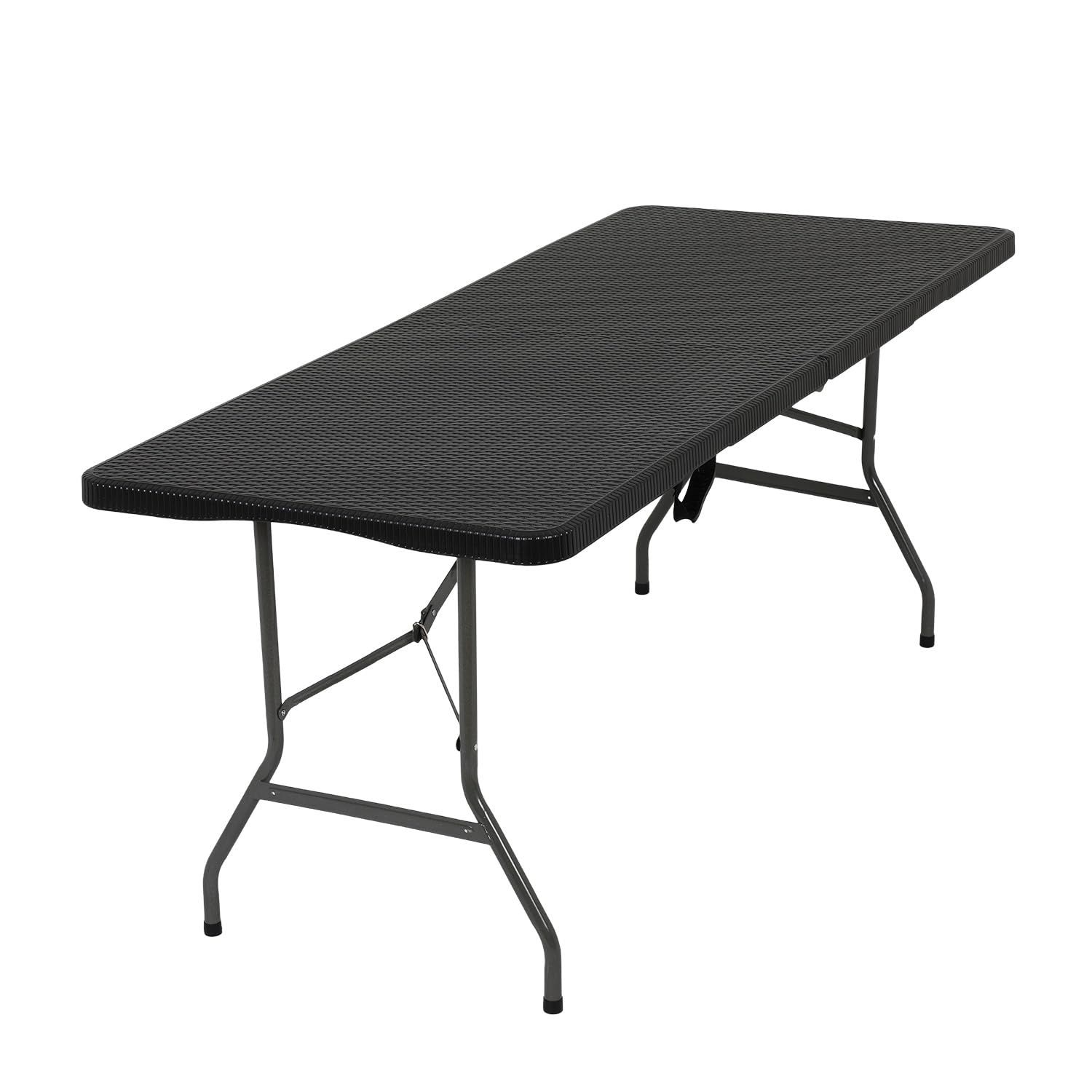 The folding table with Powder-coated steel legs,it can be open and folded in a few seconds.The 6 foot folding table features a waterproof top that resists spills and weather.It is designed with enough room to seat 4-6 people.Ideal for parties, backyard events, traveling, family exercises, etc. You can take the plastic table to everywhere you want.