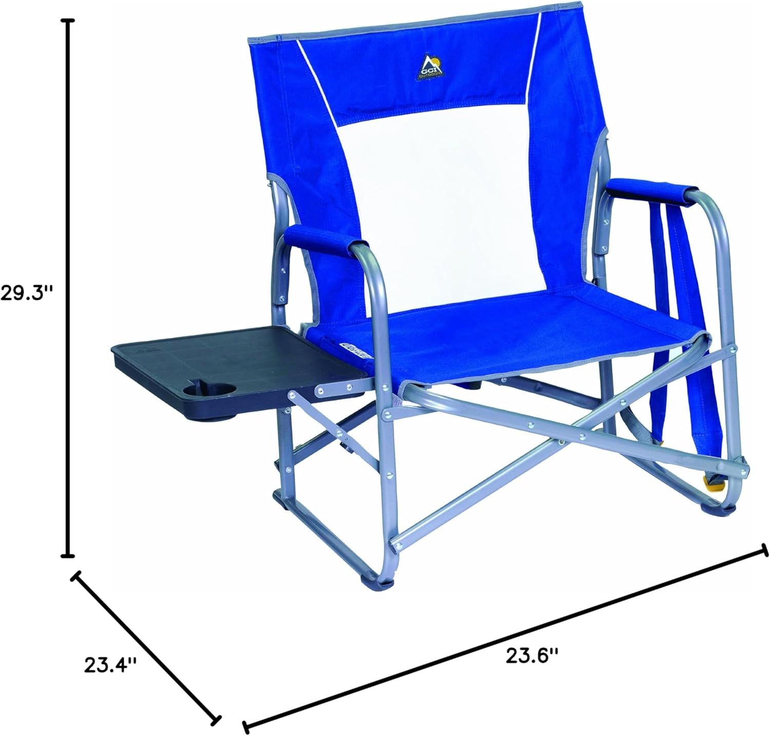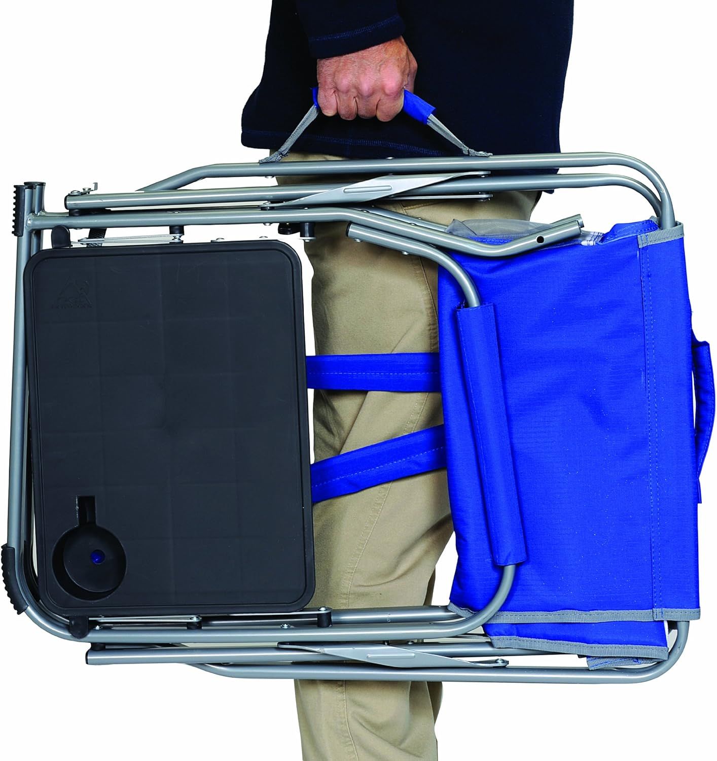 A truly versatile folding chair, this lightweight event chair features padded armrests and a side table with a built-in beverage holder. Equipped with backpack carry straps for hands-free portability, these camping chairs for adults are ideal for music festivals, tailgating, and everything in between. These camping chairs are constructed of sturdy powder-coated steel engineered to support up to 250 pounds. Camp chairs for adults weigh 11.2 pounds and measure 23.6 x 29.3 x 23.4 when open with a seat height of 13.6 and fold down to 21.1 x 21.25 x 3 inches. Limited lifetime warranty.