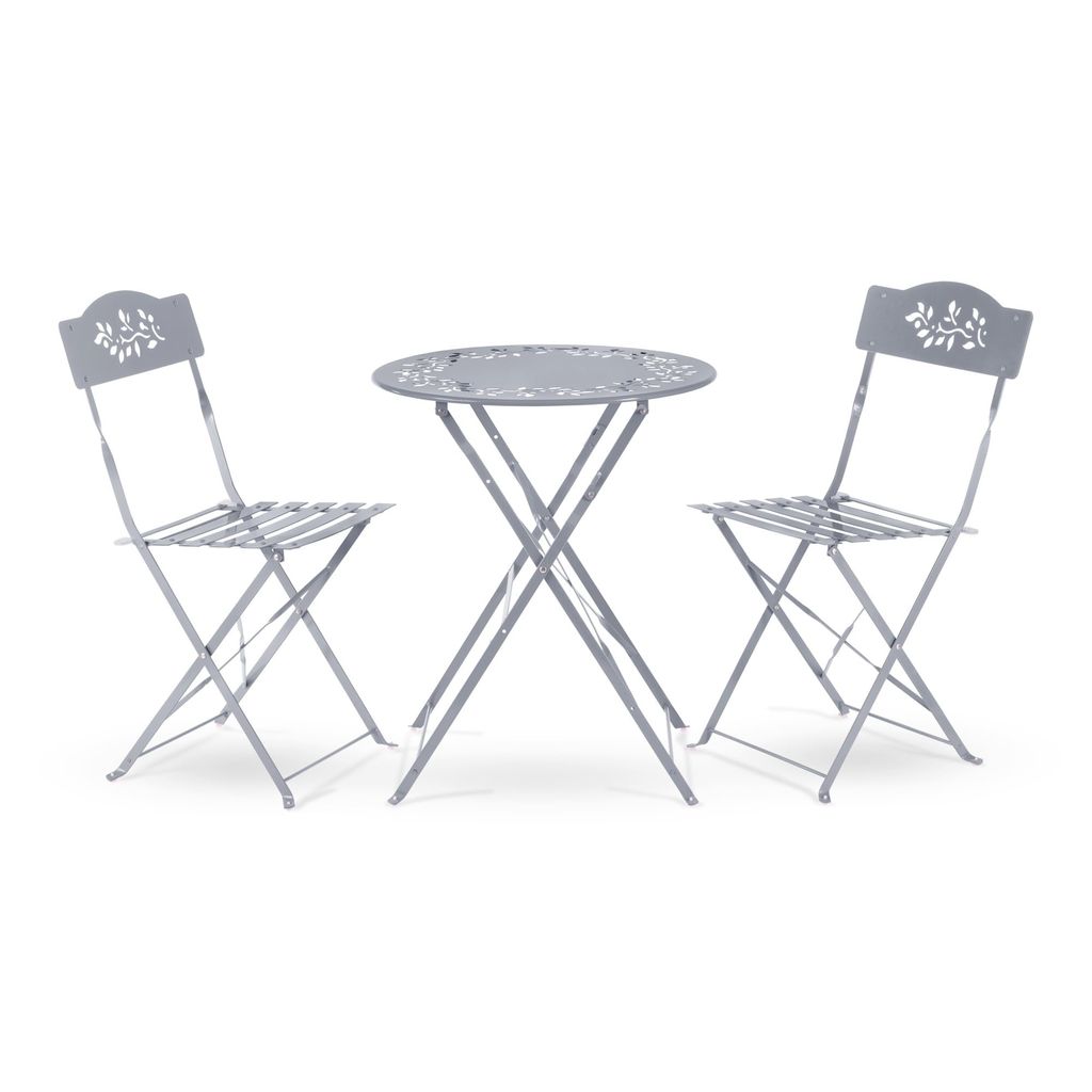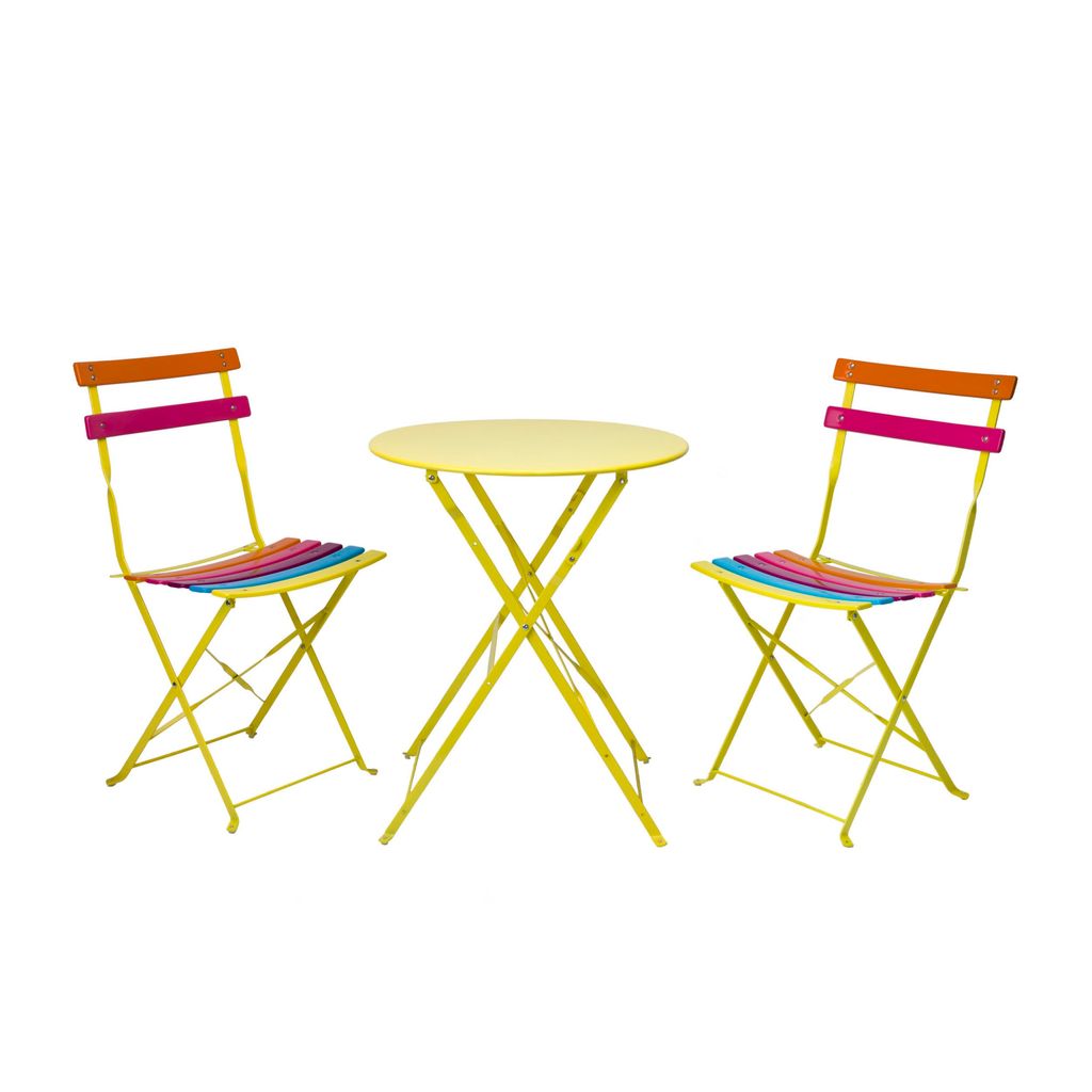 Enjoy friendly conversation and a cappuccino with the Indoor/Outdoor 3-Piece Bistro Set from Alpine Corporation. This brightly finished table and chairs set will bring a smile to your face with its fun, joyful color and its intricate laser cut leaf pattern. The 3-piece set includes a folding table and 2 folding chairs and is perfect for smaller outdoor spaces, like apartment balconies or studio apartment eating areas. Skillfully crafted from tough, long-lasting steel and painted with a solid colored hue, the patio set is durable and resists pooling of water with the slat chair design. All 3 pieces are lightweight and foldable, making them easy to pick up and transport to your preferred outdoor area for al fresco dining or enjoying your morning coffee indoors in your breakfast nook. They're also compact and easy to store when you're not using them. This table and chairs set is easy to maintain and clean. Simply wipe down with water and a mild soap or detergent to keep it looking brand new. The folding bistro table measures 24"L x 24"W x 28"H and the folding chairs measure 17"L x 18"W x 33"H, and includes a one year manufacturer's Support from date of purchase. Alpine Corporation is one of America's leading designers, importers, and distributors of superior quality home and garden decor products. Alpine Corporation's award winning in-house design team continuously develops new and innovative "statement pieces" for your home and garden. Your indoor and outdoor living spaces will be the envy of the neighborhood with our wide assortment of fresh, fashionable and contemporary products, from beautifully crafted solar garden stakes featuring patented motion and fiber optic lighting technology to beautiful fountains and delightful bird baths and feeders.