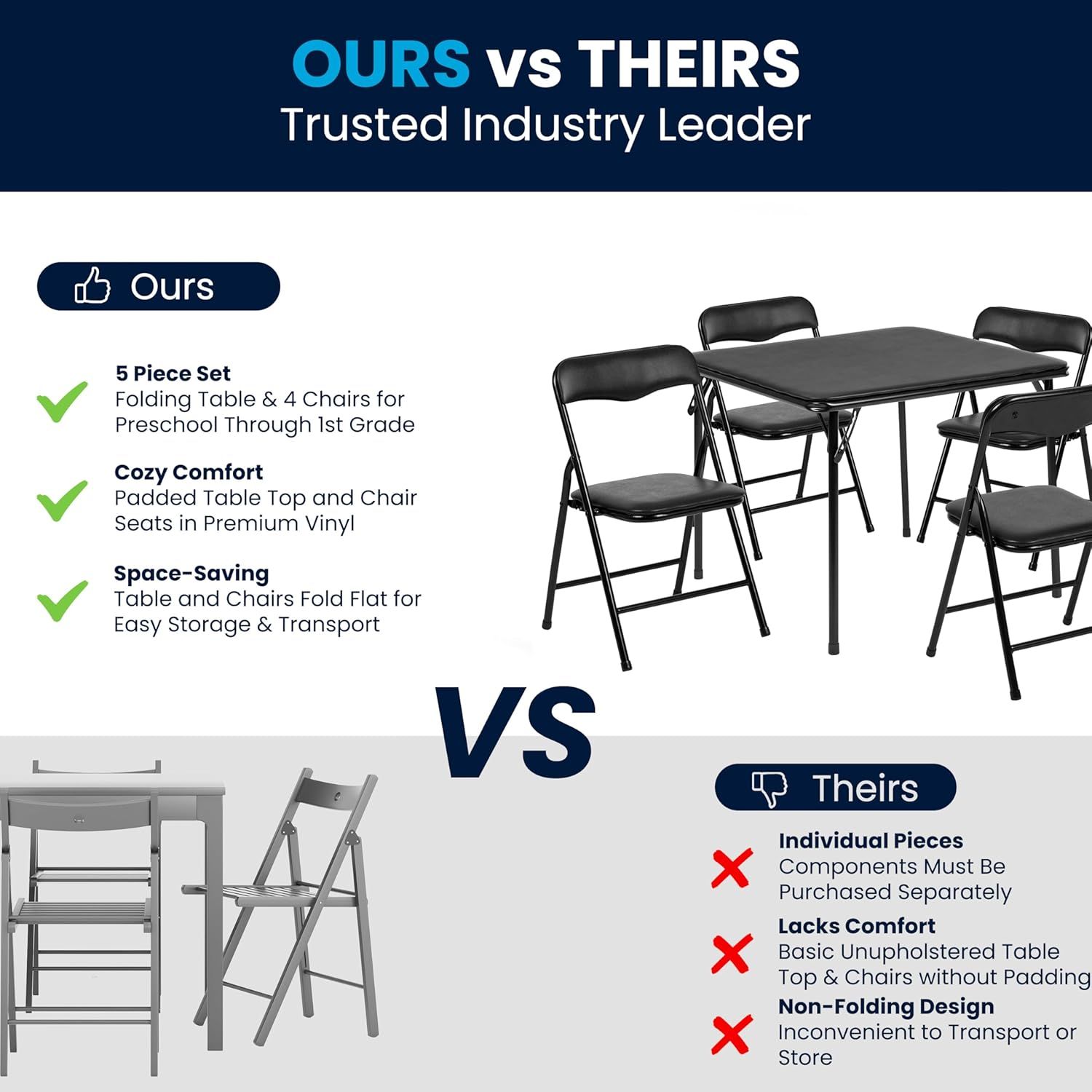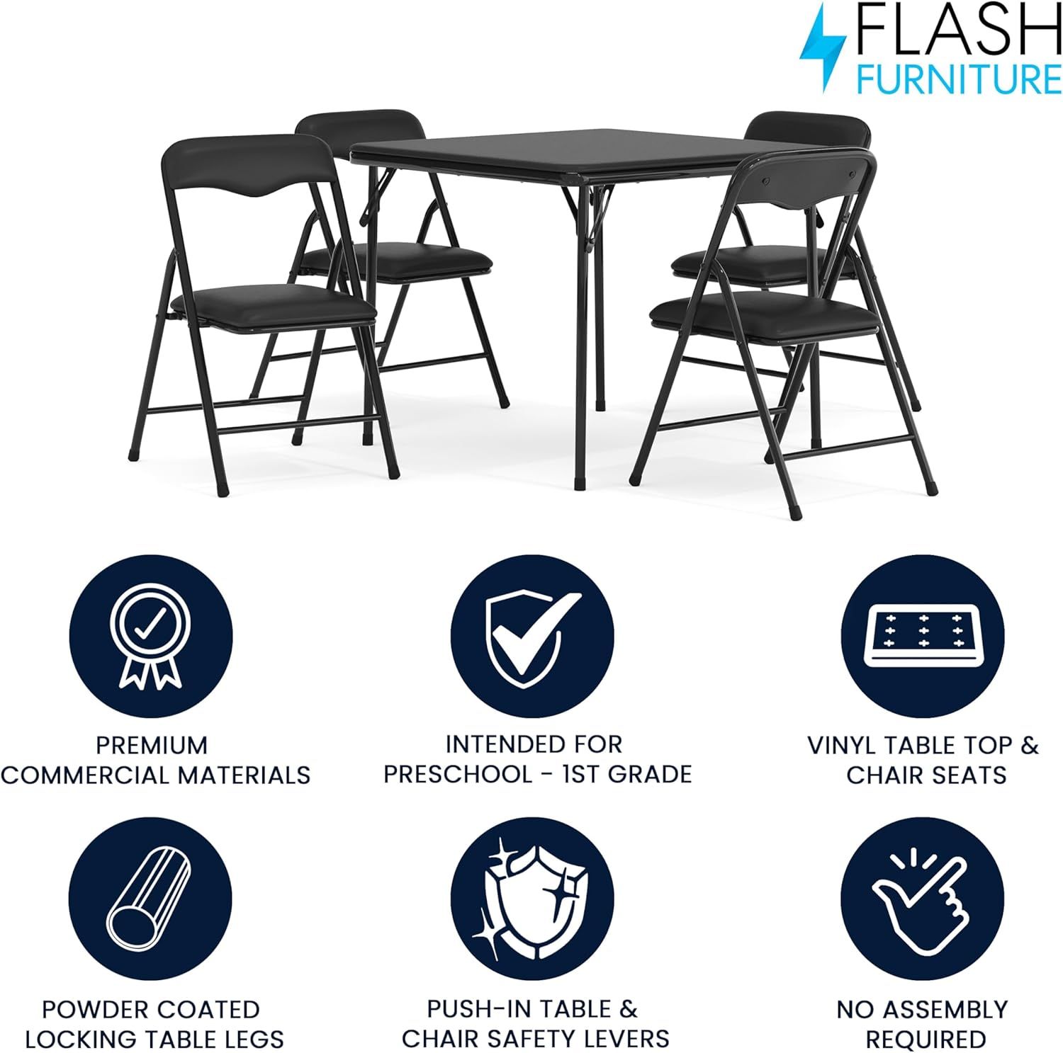 Create a space for your little ones in the classroom or home with the Flash Furniture Mindy Kids 5-Piece Folding Table and Chairs Set. This kids table set includes one square folding table and four folding chairs to provide the perfect place for young students and kids to enjoy snacks or meals, get creative with arts and crafts, read a book, or play educational games. The set is recommended for preschool through first grade aged children and is great for use in shared spaces in your daycare center, preschool, kitchen, bedroom, or playroom. The classroom table and chairs fold to store behind other furniture and inside closets. As an additional safety measure, a metal lever must be pushed in to unlock the table and chairs before they can fold to prevent unintended collapse. Simply push in the metal lever to unlock and then fold. Constructed from durable vinyl, the kids table and chairs set withstands years of quality use. The children's table measures 24" W x 24" D x 20.25" H and holds up to 70 pounds of static weight. Each small chair measures 12.5" W x 13.5" D x 21.25" H with a 10.5" W x 10.5" D x 12.25" H seat size, 12.5" W x 10" H back size, and 13" W x 1.25" D x 21.25" H folded size and holds up to 81 pounds of static weight.