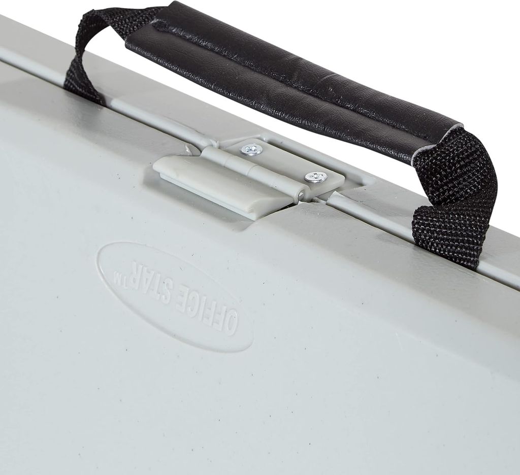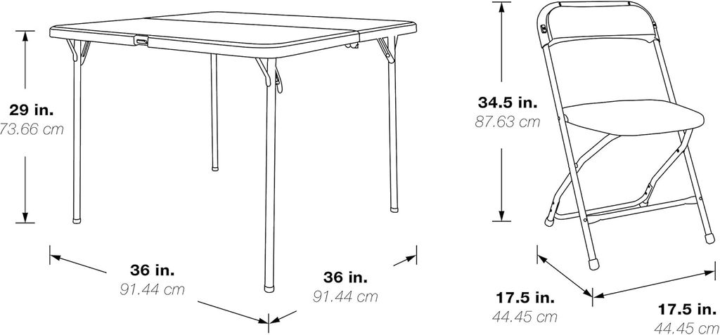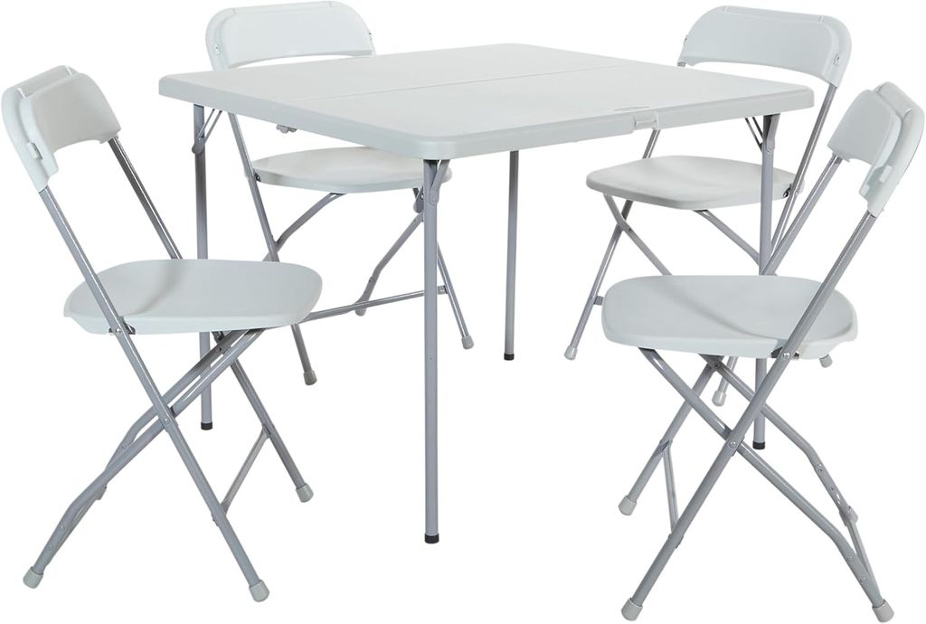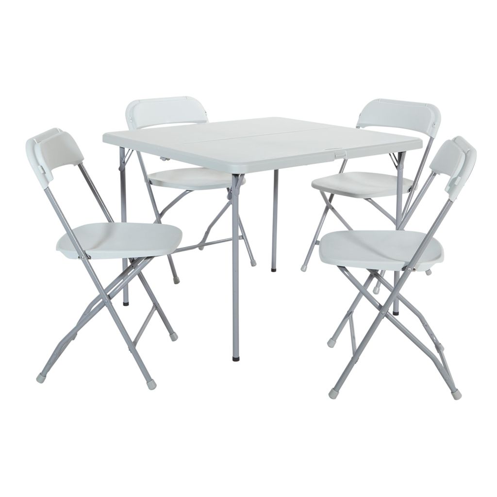 An economical, user-friendly choice for offices, classrooms, and events, Office Star's resin furniture offers lightweight yet durable solutions to workspace, dining, and seating needs. This five-piece folding table and chair set features four armless chairs with heavy-duty white seats and backs crafted of waterproof, stainproof, scratch-, and impact-resistant blow-mold resin and a 36-inch-square table with a matching resin top. Dark gray powder-coated steel tube frames offer low-profile stability, and rubber end caps protect floors from damage. For space-saving storage, the table folds in half and the chair seats flip up to stack neatly. The table stands 29 inches high and each chair measures 17-3/4 inches wide by 17-1/2 inches deep by 34-1/2 inches high. The total weight is 49 pounds with a 200-pound load capacity. Designed for indoor and outdoor use; easy clean-up. --Kara Karll