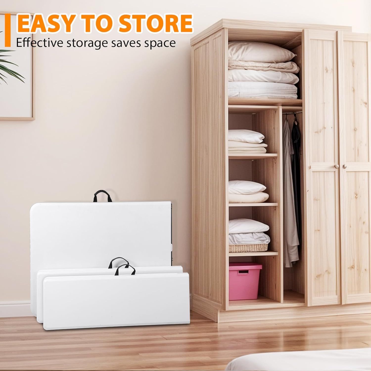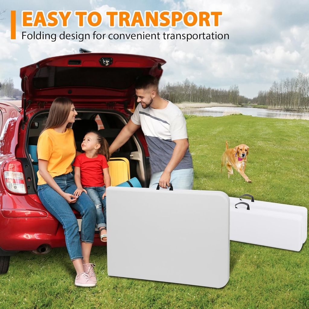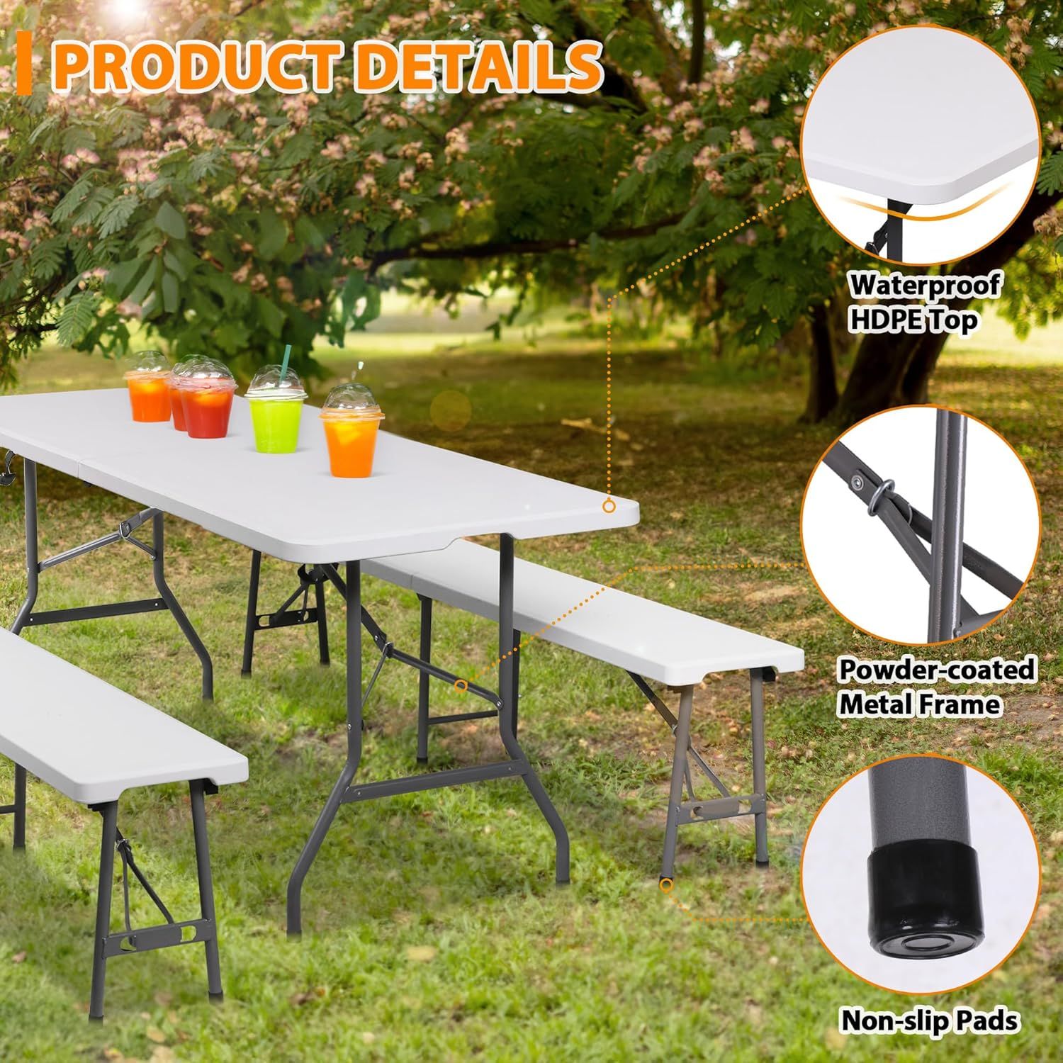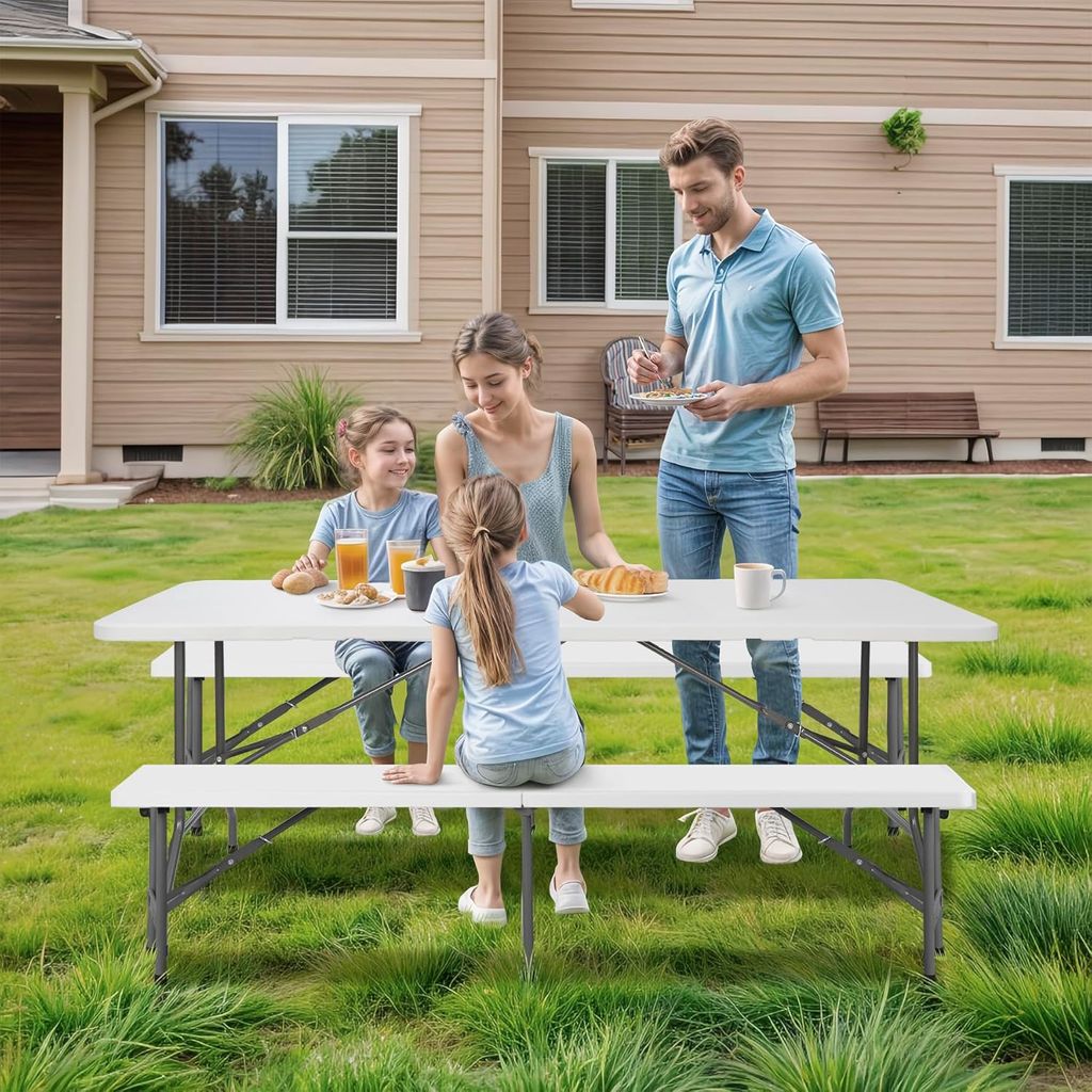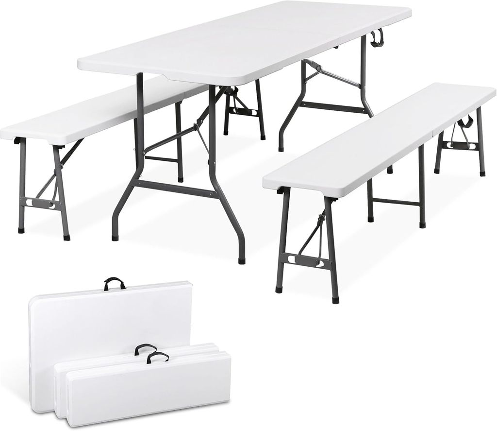 SUPER DEAL Folding Table Set with 2 Benches, 6 FT Camping Picnic Table Set, Outdoor Indoor Portable Furniture for Working Meeting Wedding Party w/Handle and Safety Lock, White