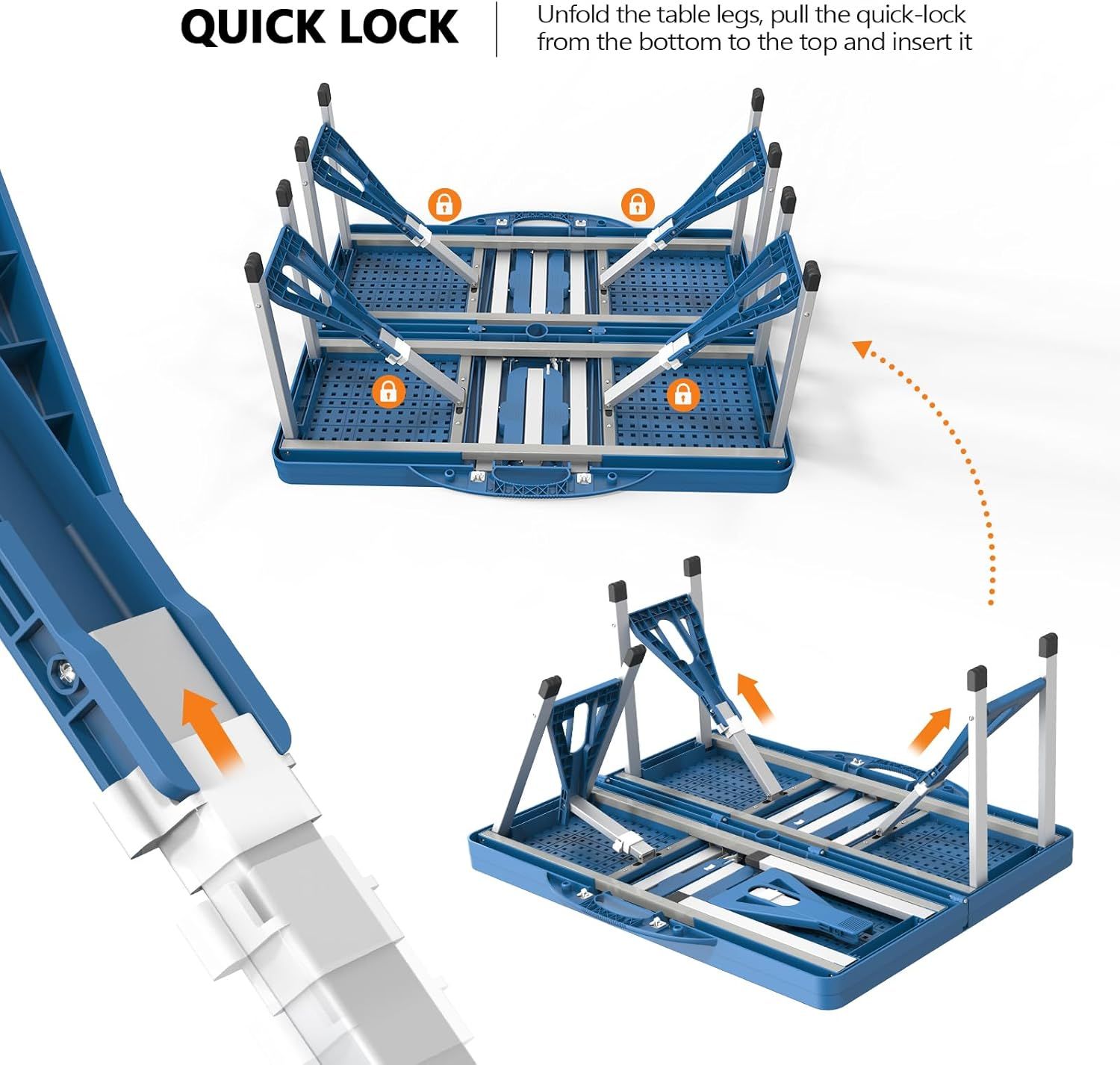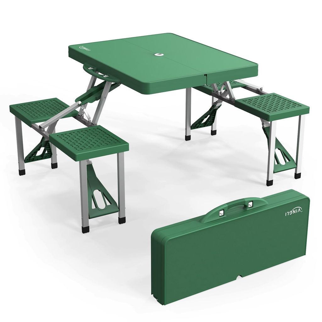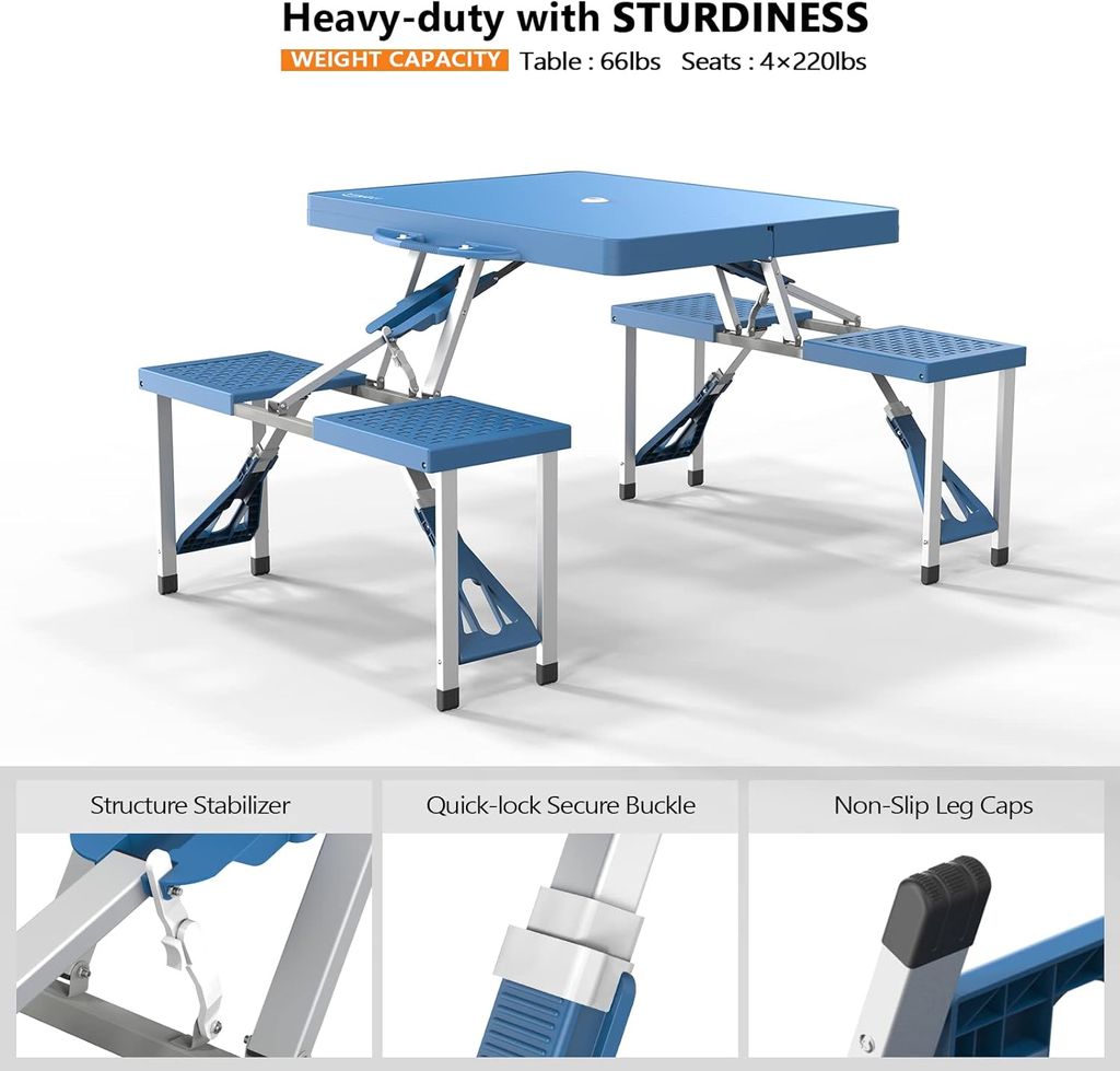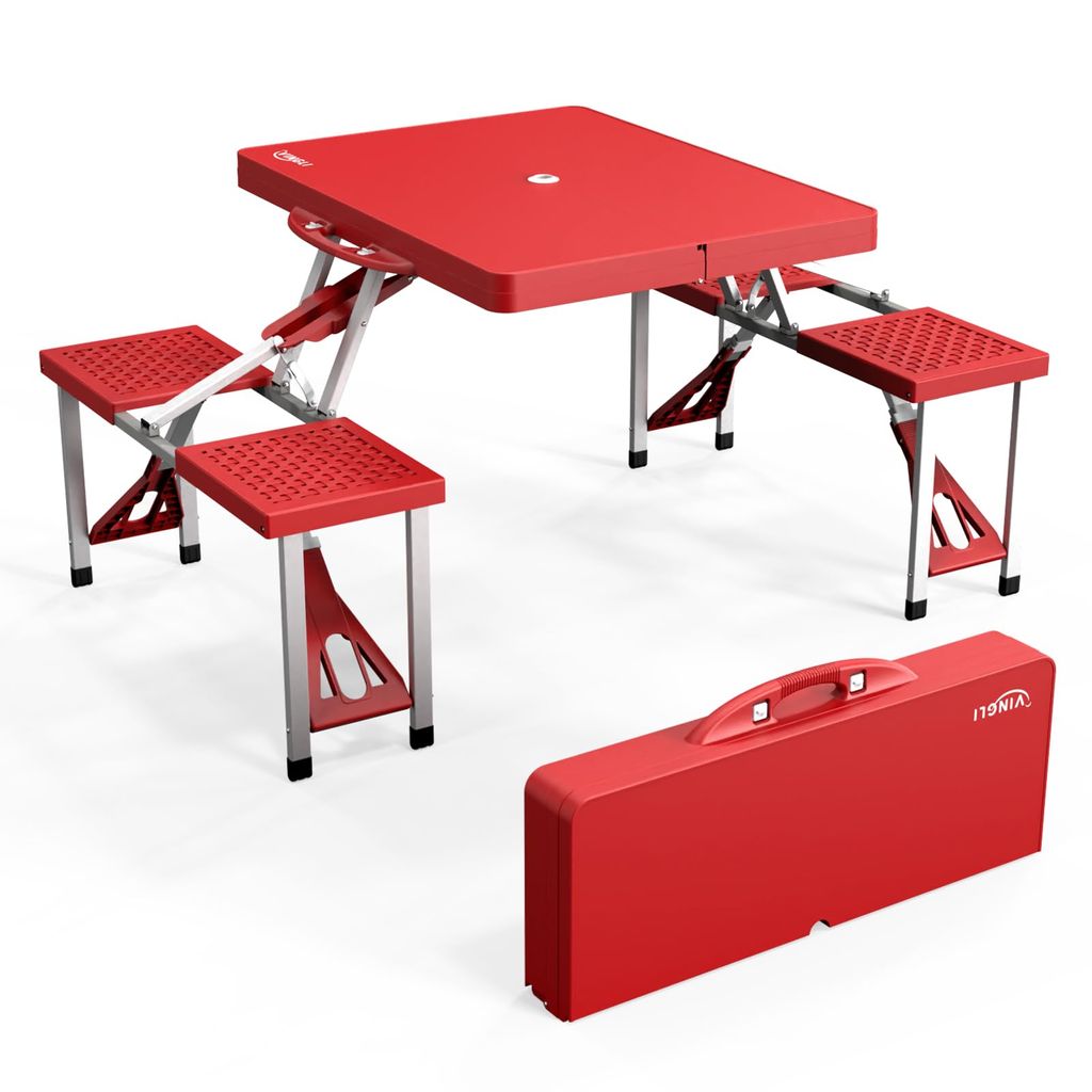 VINGLI 4 Ft Camping Picnic Table Set with 4 Seats with Umbrella Hole Folding Lightweight Suitcase Card Table-220 Lbs Support Aluminum Frame, Plastic RV Tabletop for Barbecue,Travel,Outing,Gathering